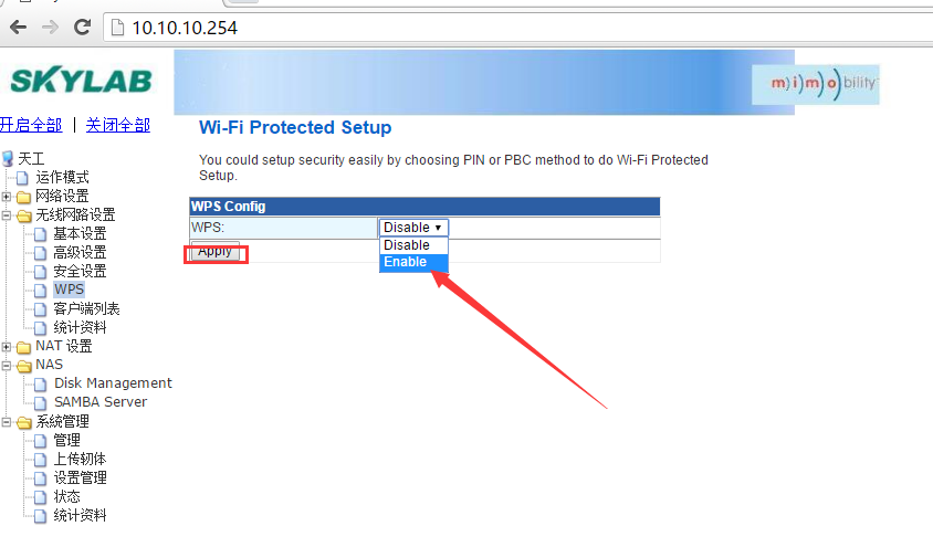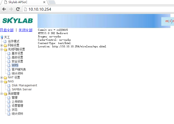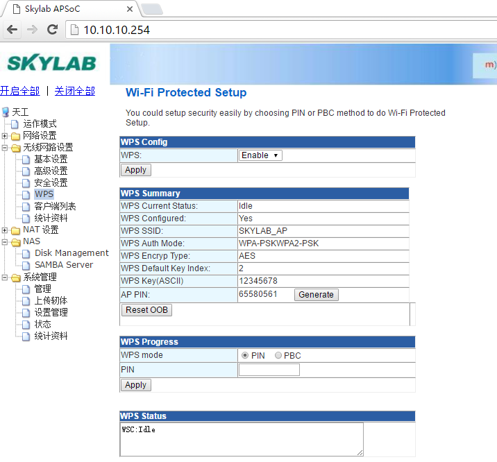 登录AP路由WiFi模块SKW92的web配置页面,找到WPS相关的设置,使能WPS功能: