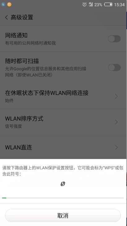 3、手机进入设置,找到WiFi设置界面,设置WPS连接(即WLAN直连):