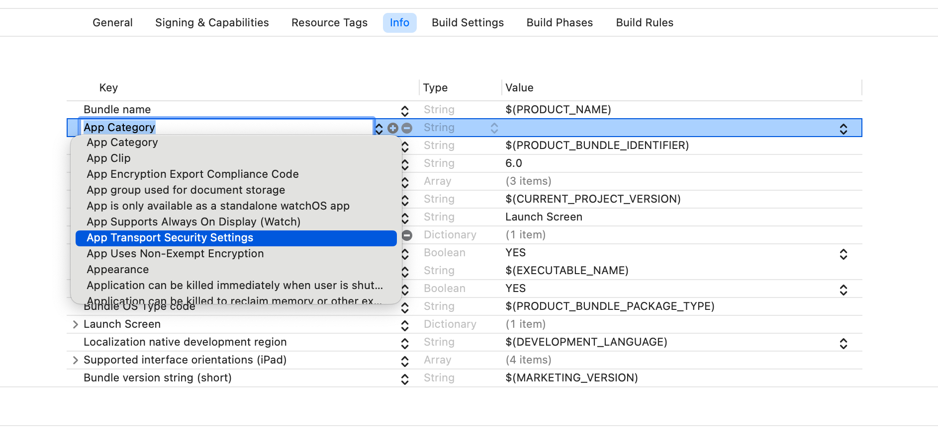 步骤1,在TARGETS>Info中的Key下点击“➕”添加一个,找到App Transport Security Settings,回车。