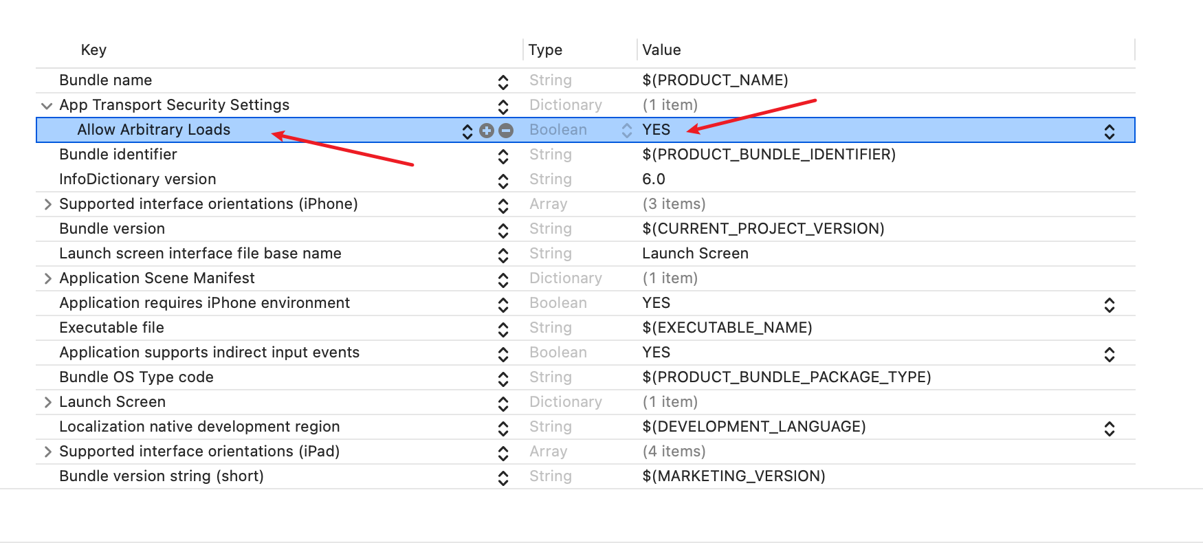 步骤2,在App Transport Security Settings下按照同样方法添加Allow Arbitrary Loads,并选择Yes即可。