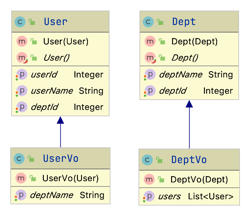 实体类与 Vo 的映射关系,作者创造性的引入特别构造器,合理利用继承关系,极大的方便了开发者完成实体类向 Vo 的转换。