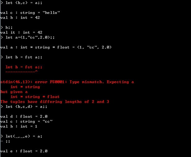 下面讲一下F#中对tuples (元组)的常用操作,对于二元元组,F#提供了fst和snd方法来得到元组的第一个标识符和第二个标识符,但是当我们要拆出多元元组的标识符时,就需要通过F#提供的可选择的拆分方法,通过对应的标识符位置来取相应的identifier,对于不需要取出的identifier,可以通过下划线,F#默认下划线为不需要取出的标识符。