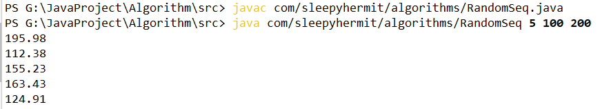 > cd src > javac com/sleepyhermit/algorithms/RandomSeq.java > java com/sleepyhermit/algorithms/RandomSeq 5 100 200
