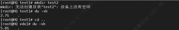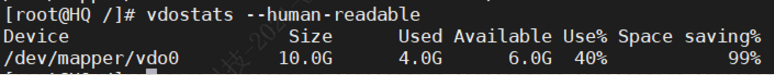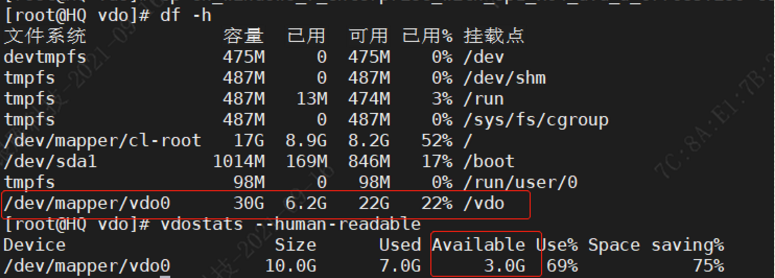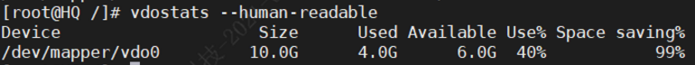 所以在使用VDO卷的系统中,如果要做磁盘空间监控。不仅要监控VDO卷的逻辑储存量剩余大小,还要监控实际物理空间的剩余大小。