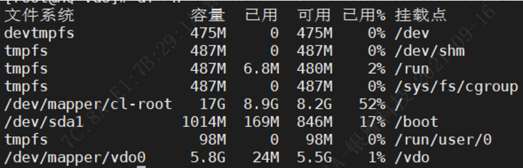 # mkdir /vdo # mount /dev/mapper/vdo0 /vdo # lsblk --output=UUID /dev/mapper/vdo0 #查看/dev/mapper/vdo0设备的UUID # vim /etc/fstab UUID=XXXXXX /vdo ext4 defaults,x-systemd.requires=vdo.service 0 0 # vdostats --human-readable #检查存储统计信息