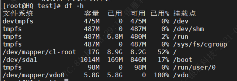 # fdisk /dev/sdb 这一步提前将/dev/sdb分成两个5G的分区 ,过程略 # pvcreate /dev/sdb1 # pvcreate /dev/sdb2 # vgcreate vdovg /dev/sdb1 # lvcreate -l 100%VG -n vdolv /dev/vdovg # vdo create --name=vdo0 --device=/dev/vdovg/vdolv --vdoLogicalSize=20G # mkfs.ext4 /dev/mapper/vdo0 # mount /dev/mapper/vdo0 /vdo