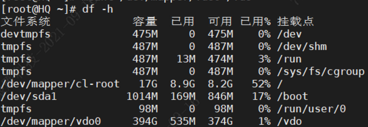 # umount /vdo # vdo growLogical --name=vdo0 --vdoLogicalSize=400G #扩容VDO卷 # resize2fs /dev/mapper/vdo0 #文件系统扩容 # mount /dev/mapper/vdo0 /vdo # df -h