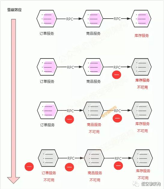 - 而订单服务也会重走商品服务的老路。结果就是三个服务都不可用了。