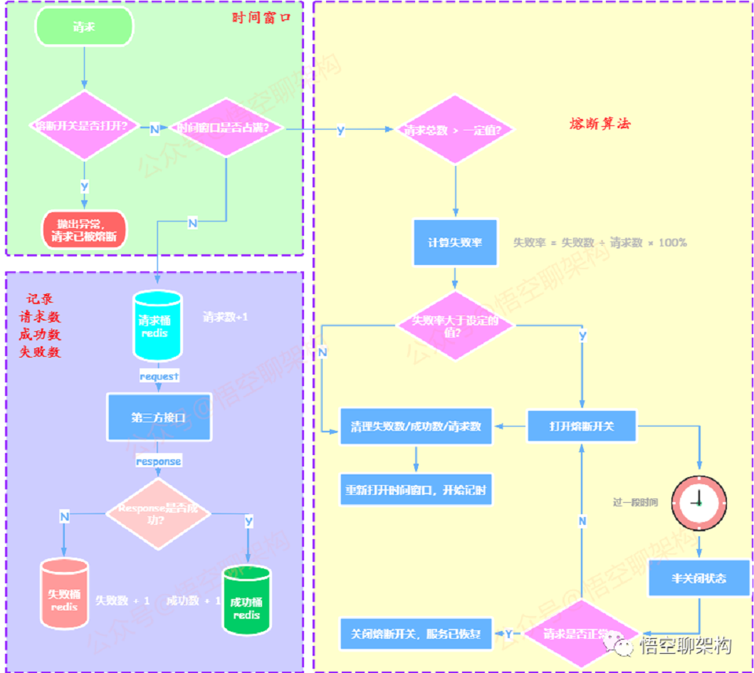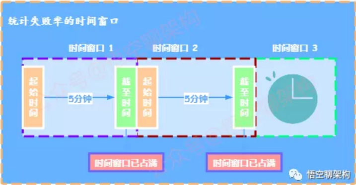 每次请求,都会判断时间窗口是否已满(如5分钟),如果时间窗口已满,则重新开始计时,且清理请求数/成功数/失败数;