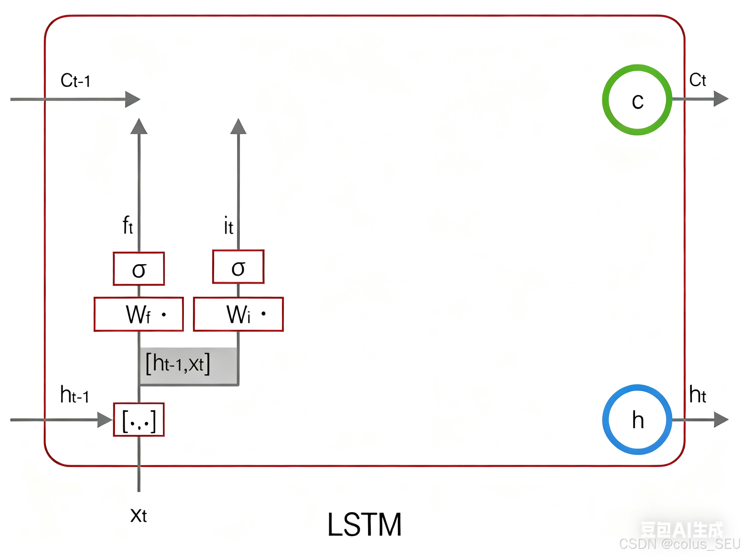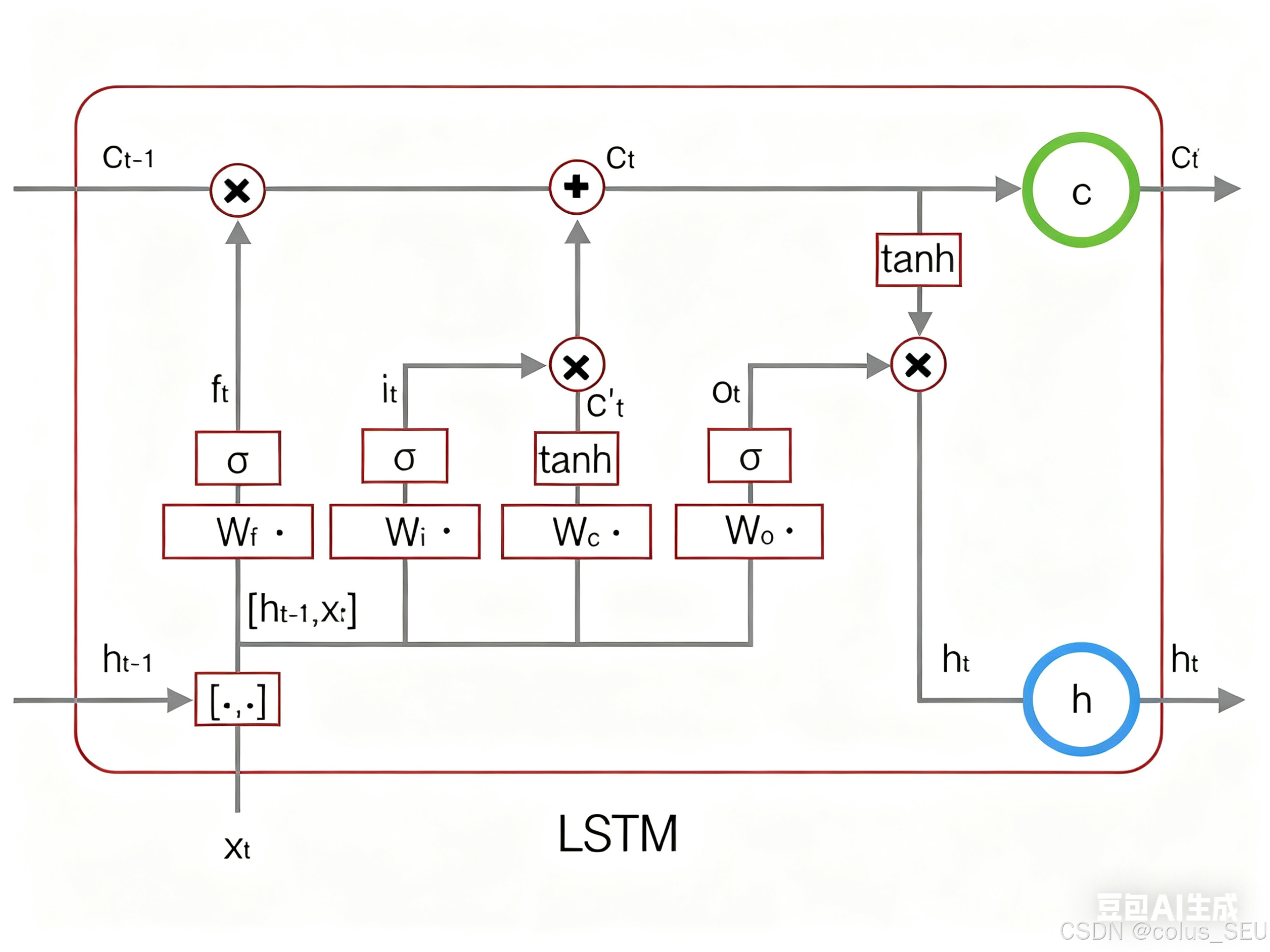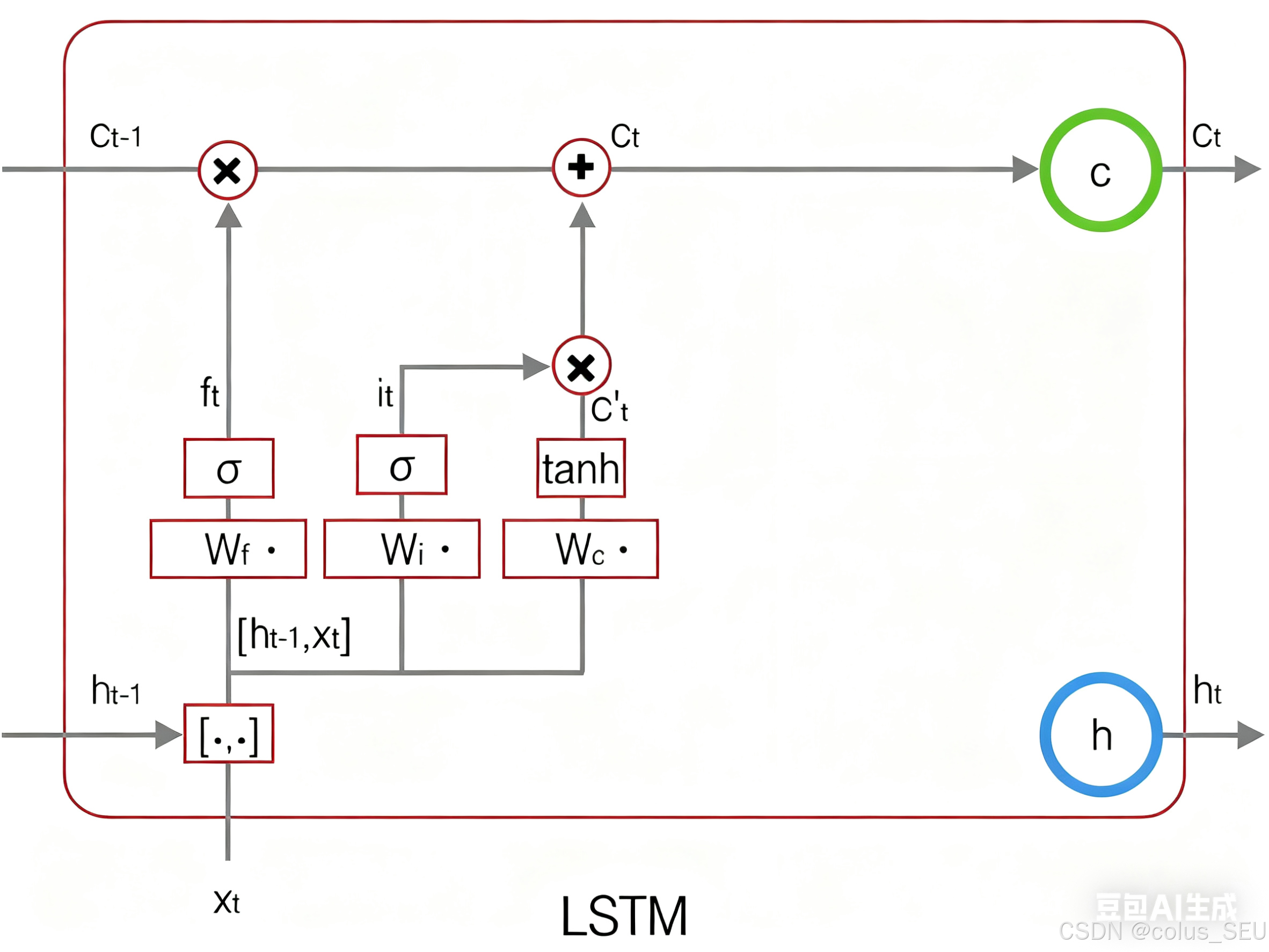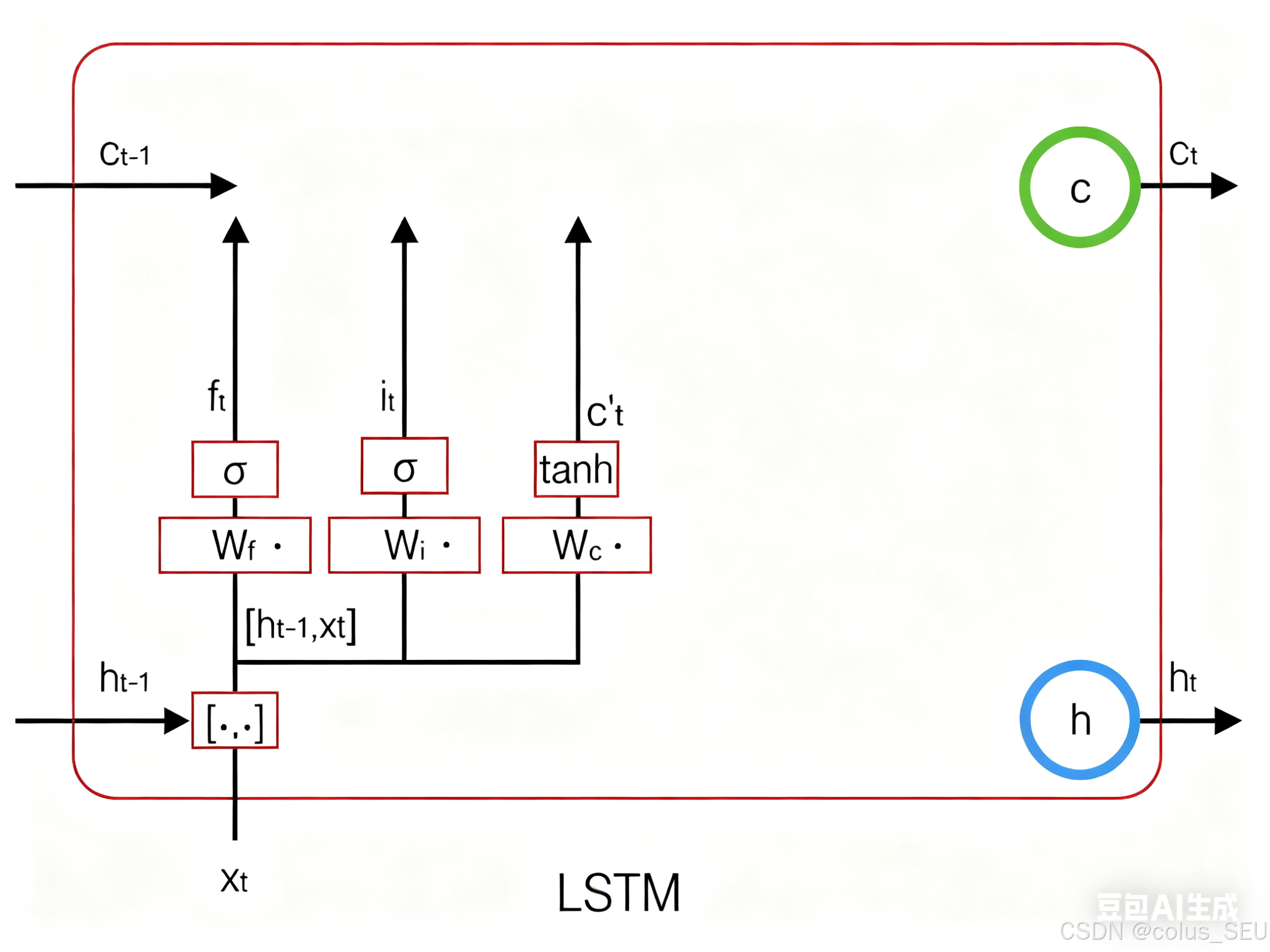 上图仅仅是一个示意图,我们可能看出,在时刻,LSTM的输入有三个:当前时刻网络的输入值