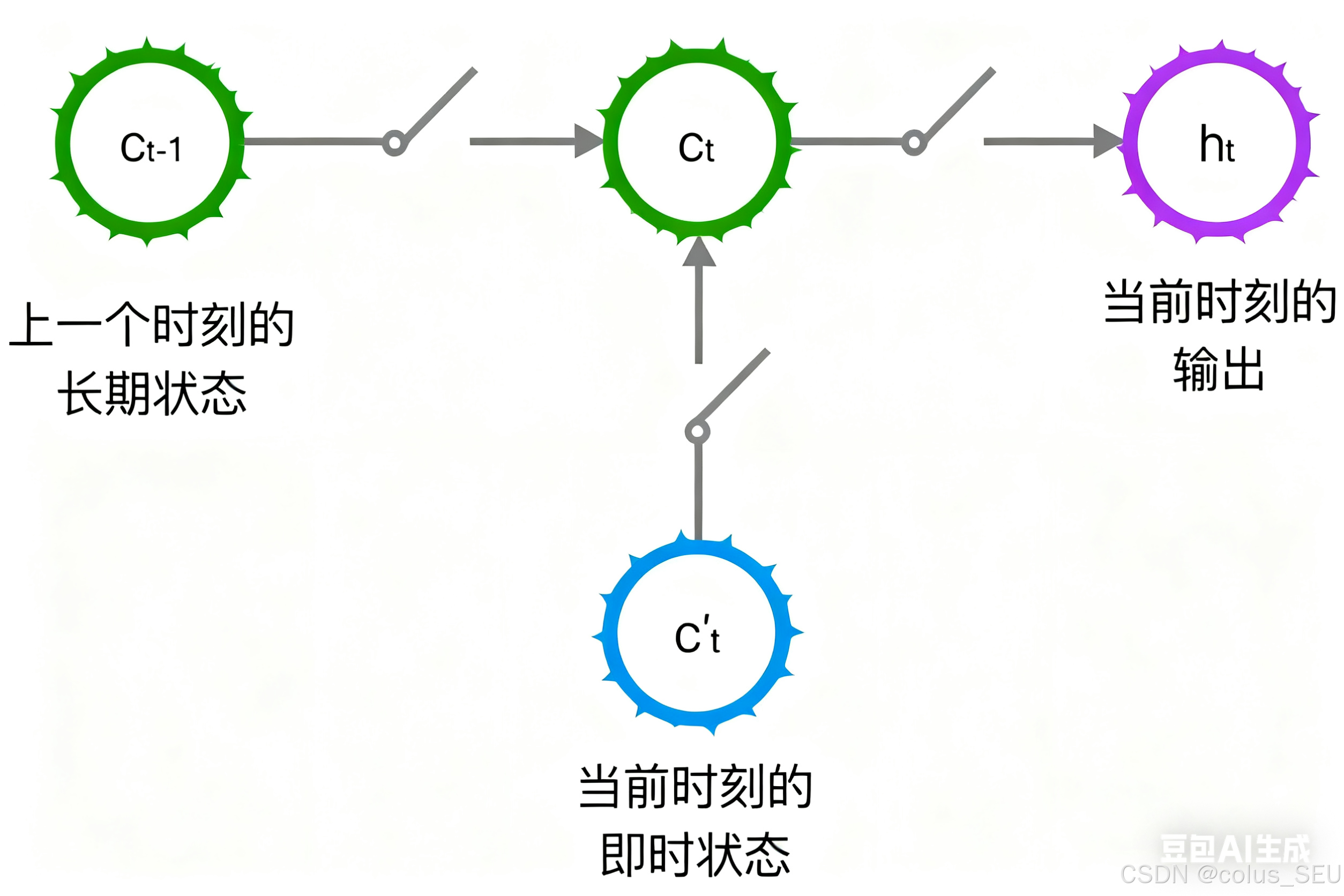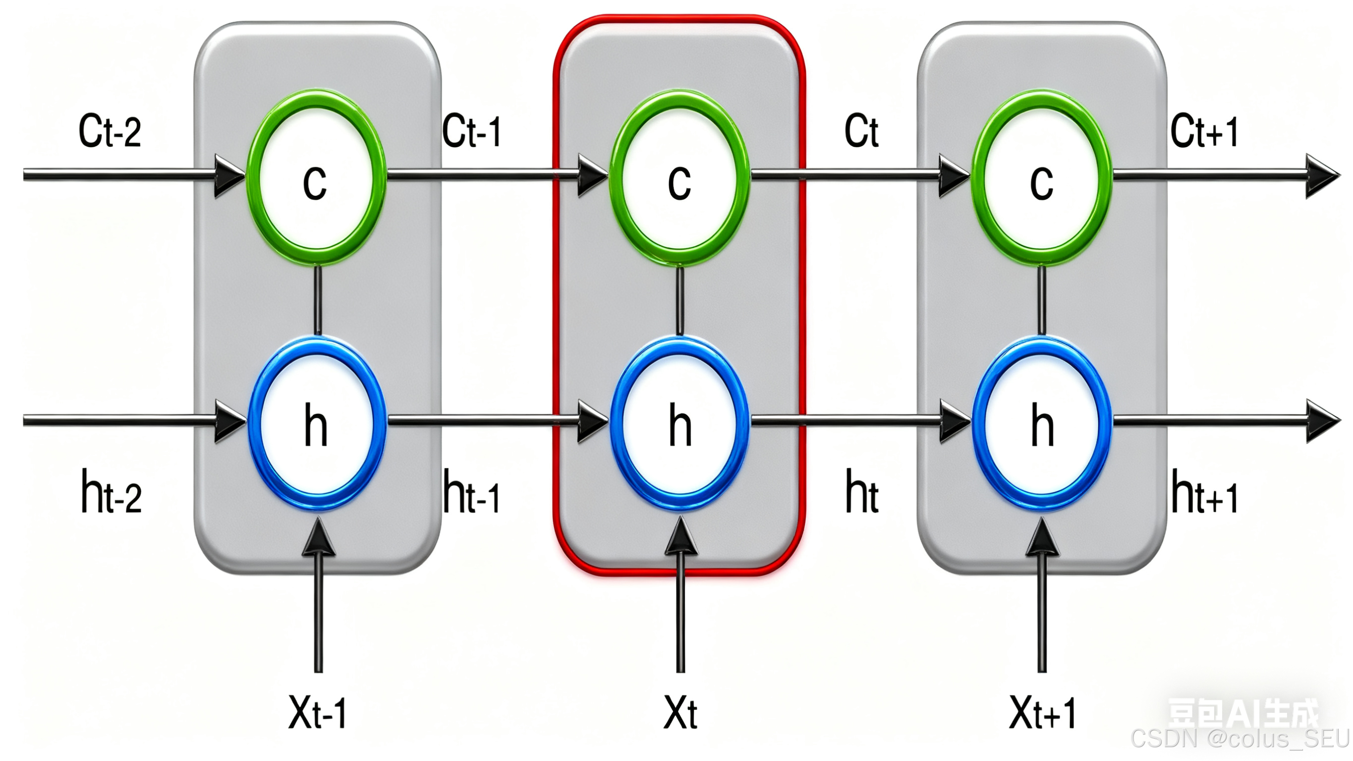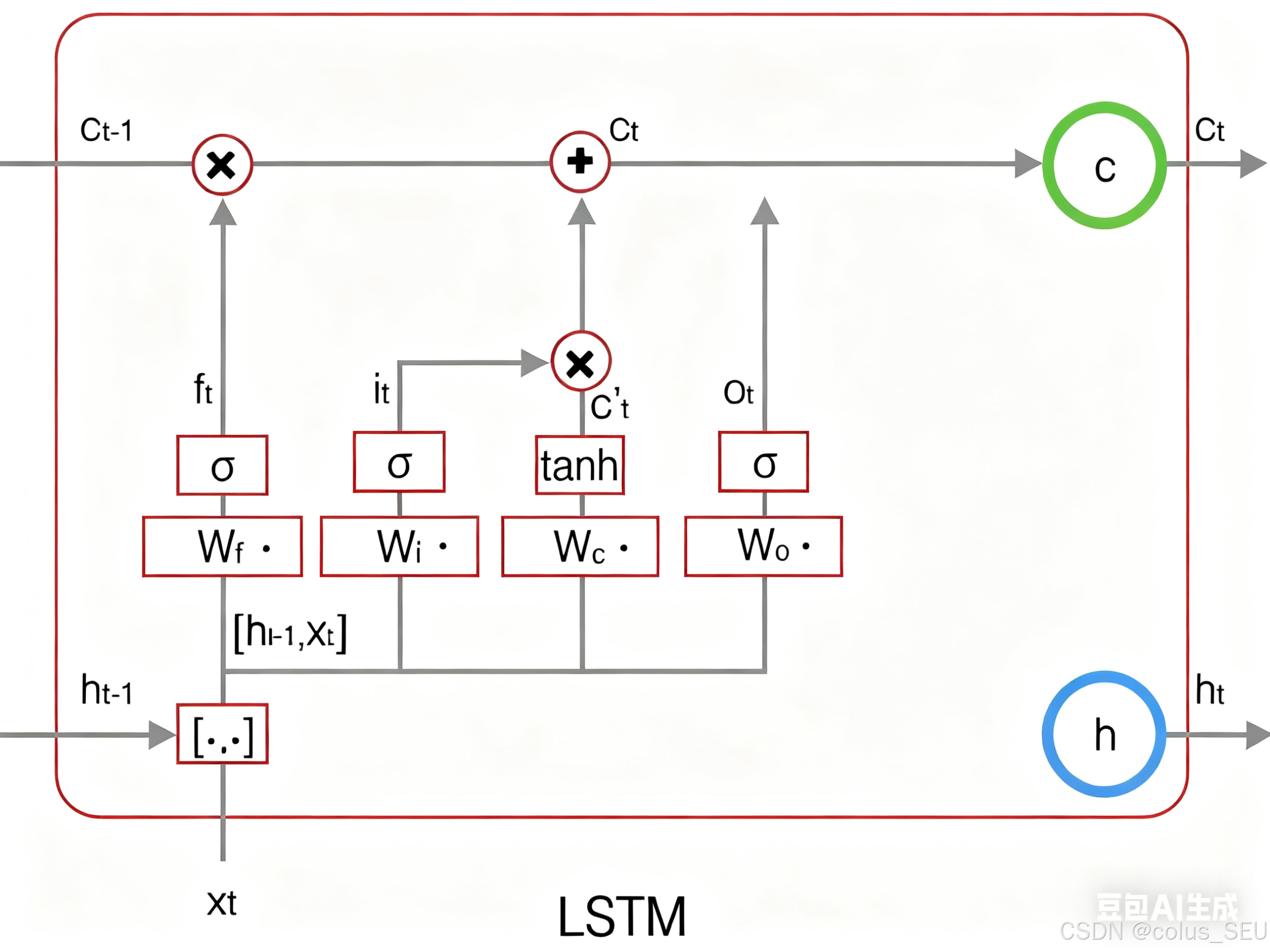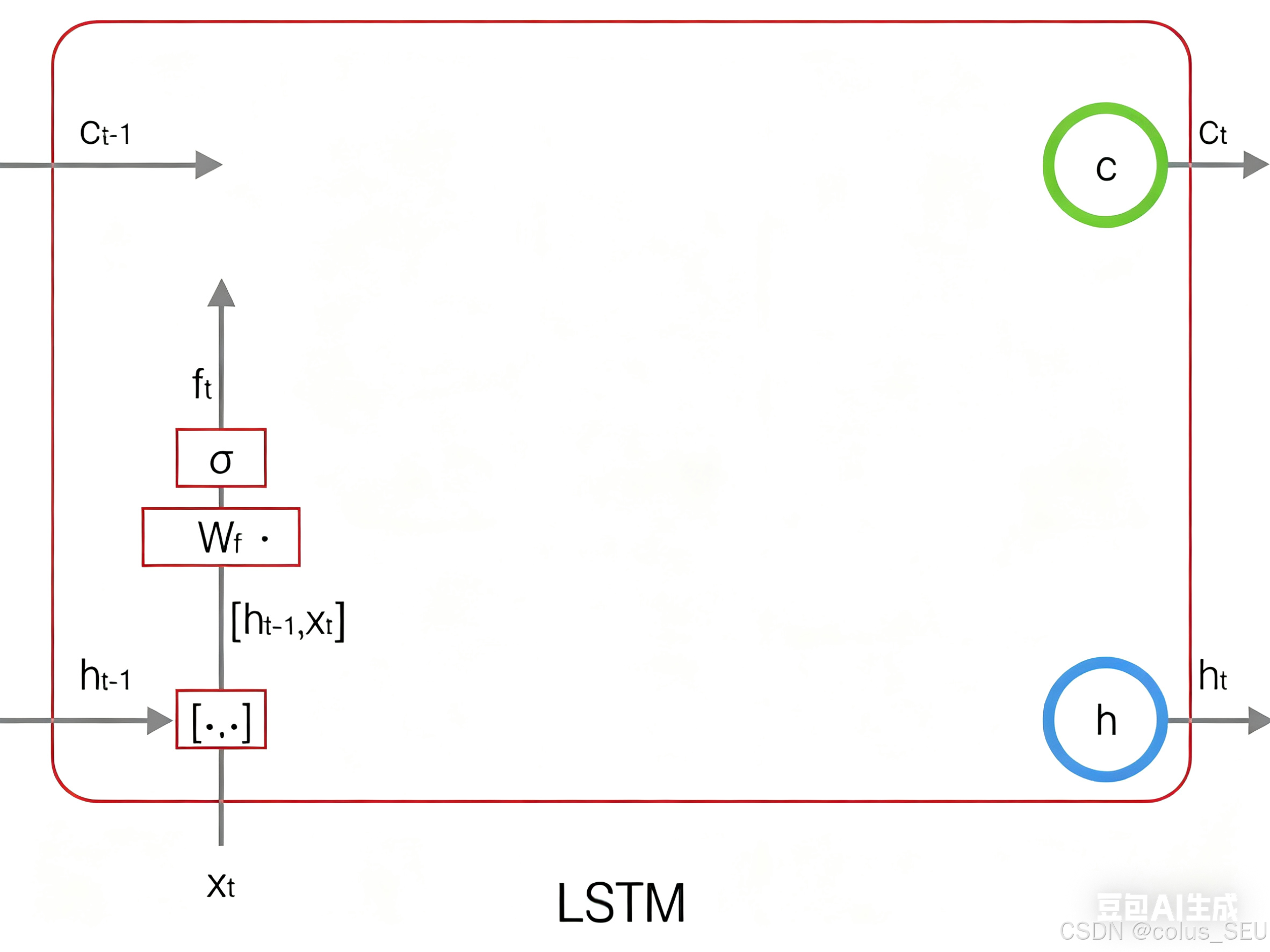 上图仅仅是一个示意图,我们可能看出,在时刻,LSTM的输入有三个:当前时刻网络的输入值