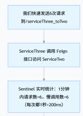 serviceTwo方法,加 300ms 睡眠(超过 200ms 慢调用阈值);访问http://localhost:8088/service-three/serviceThree_toTwo,快速刷新 2 次: