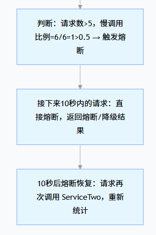适用场景:下游服务(如 ServiceTwo)因数据库慢、网络卡等原因,响应时间变长(比如正常 100ms,现在要 1 秒),此时触发熔断,避免 ServiceThree 的线程被长时间占用。
