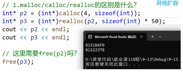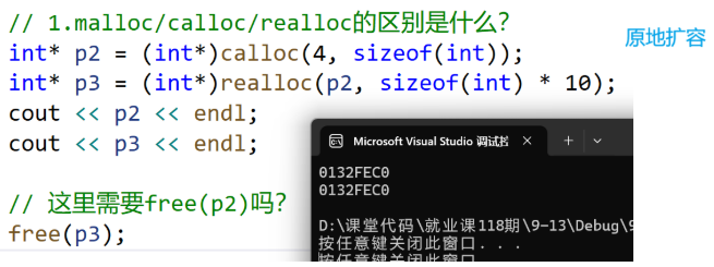 malloc开辟空间,calloc开辟空间的同时还初始化,realloc扩容(原地扩容或者重新找一块地方)