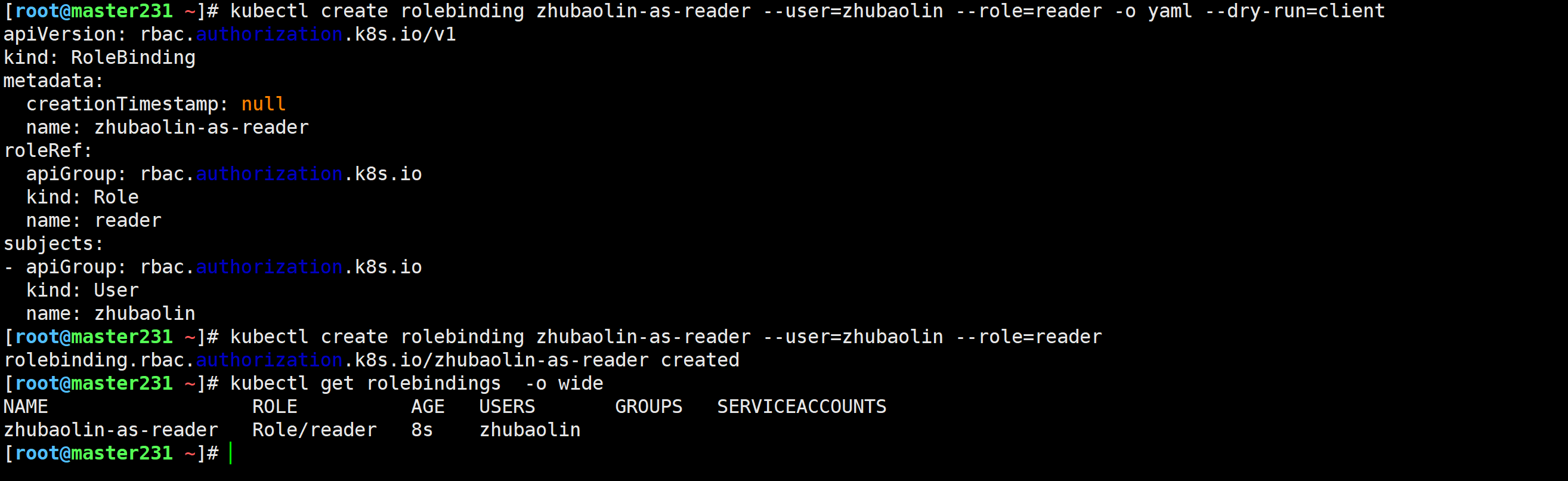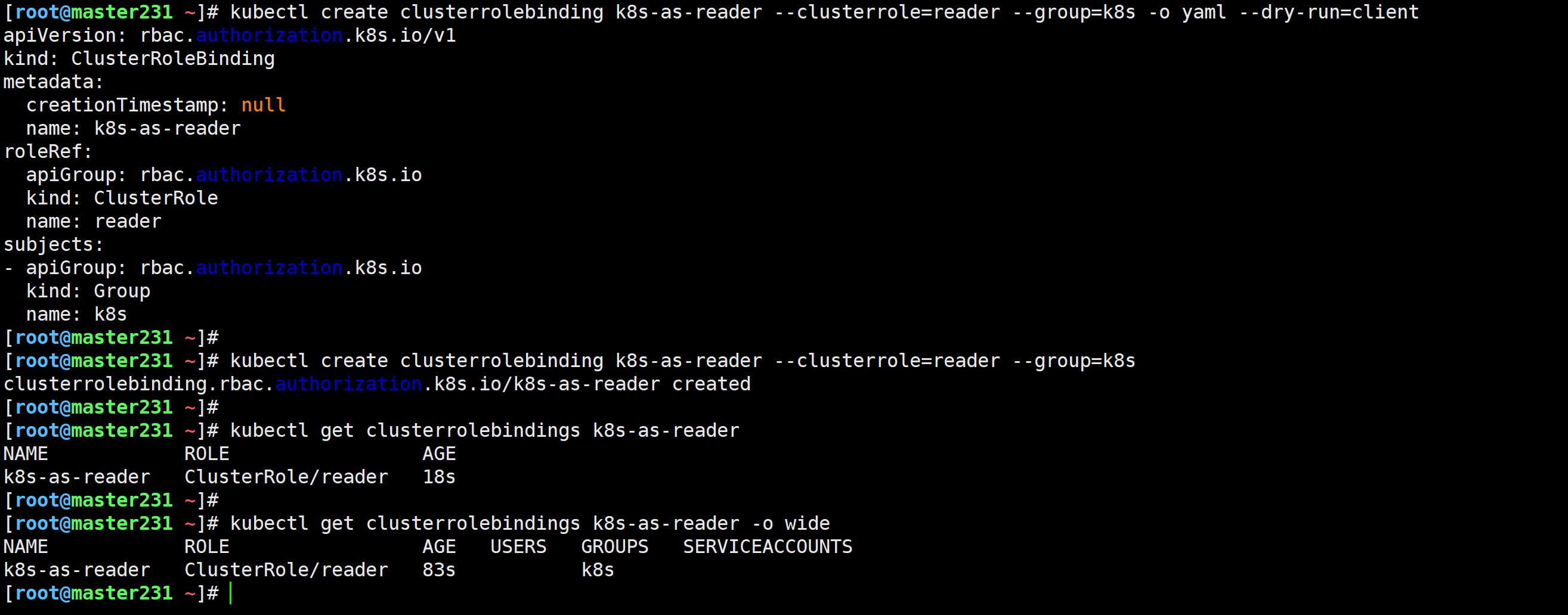 Cluster级别:称为ClusterRoleBinding,可以将实体(User、Group或ServiceAccount)关联至ClusterRole。
