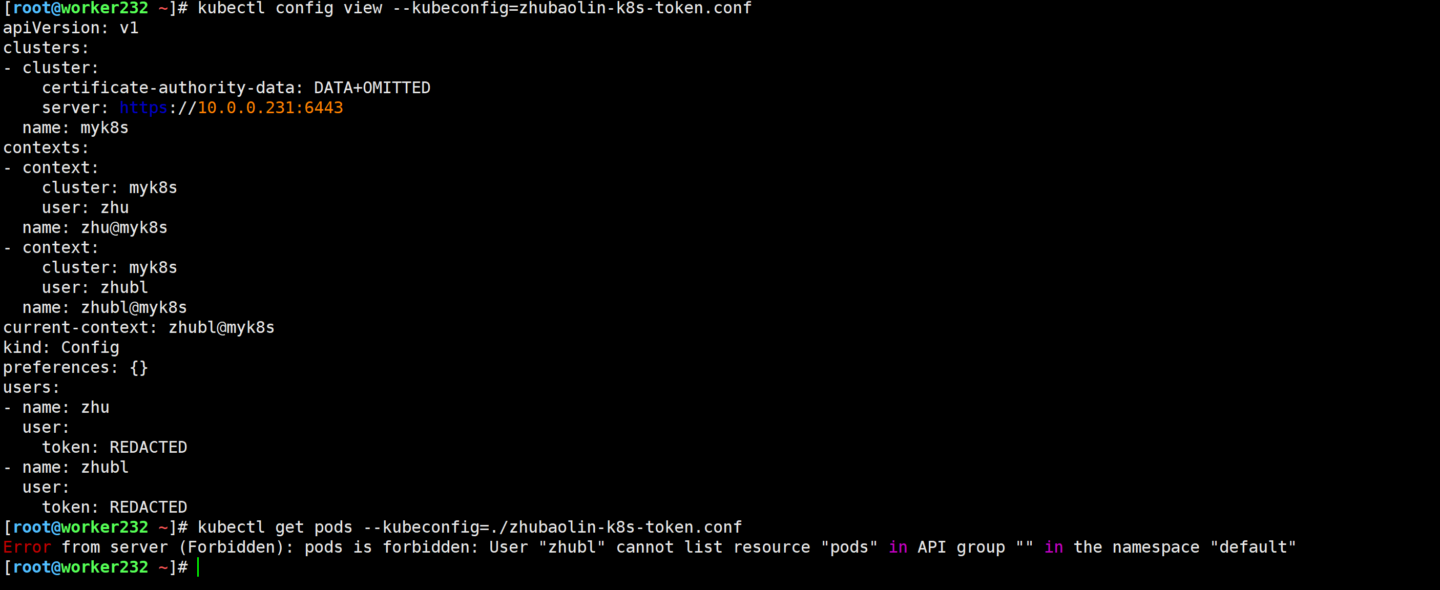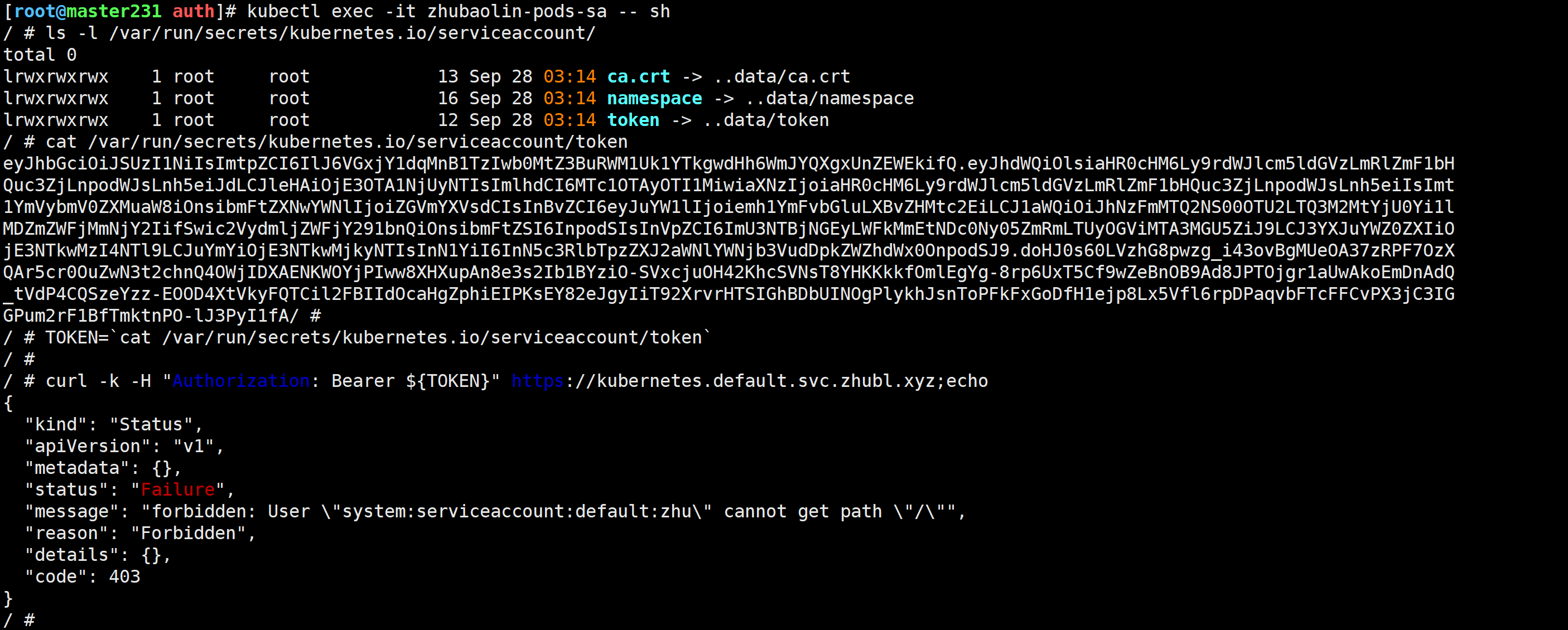 / # curl -k -H "Authorization: Bearer ${TOKEN}" https://kubernetes.default.svc.zhubl.xyz;echo
