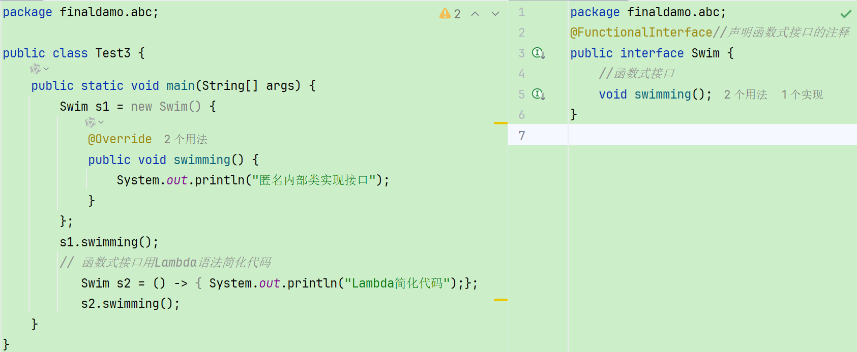 - 抽象方法的数量 严格等于 1(可以有默认方法、静态方法,这些不算抽象方法)