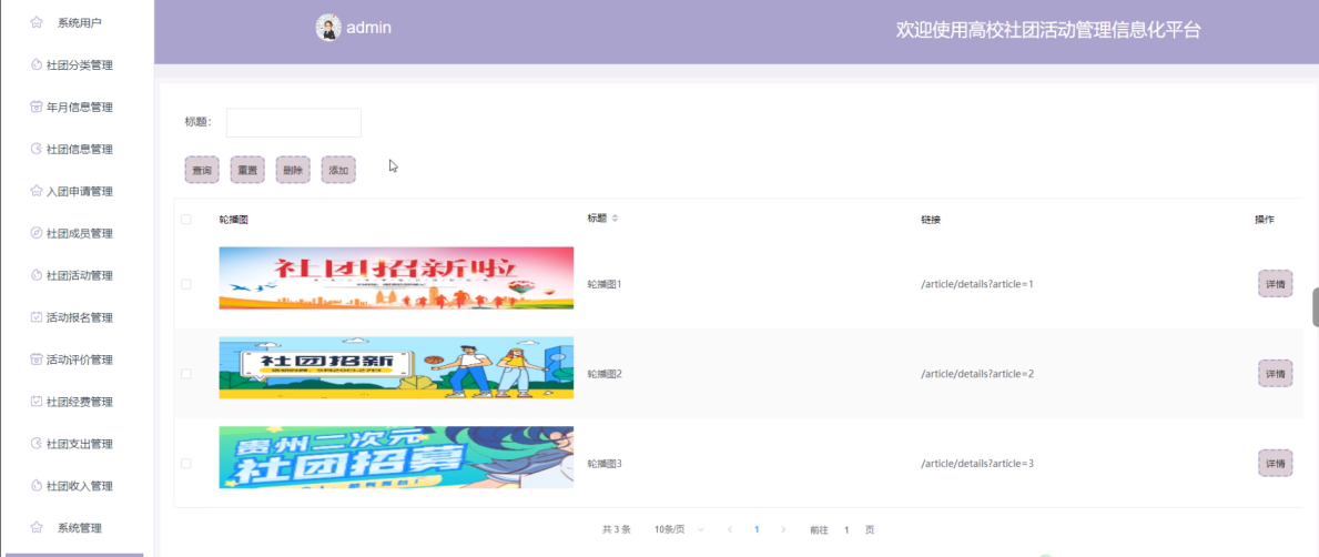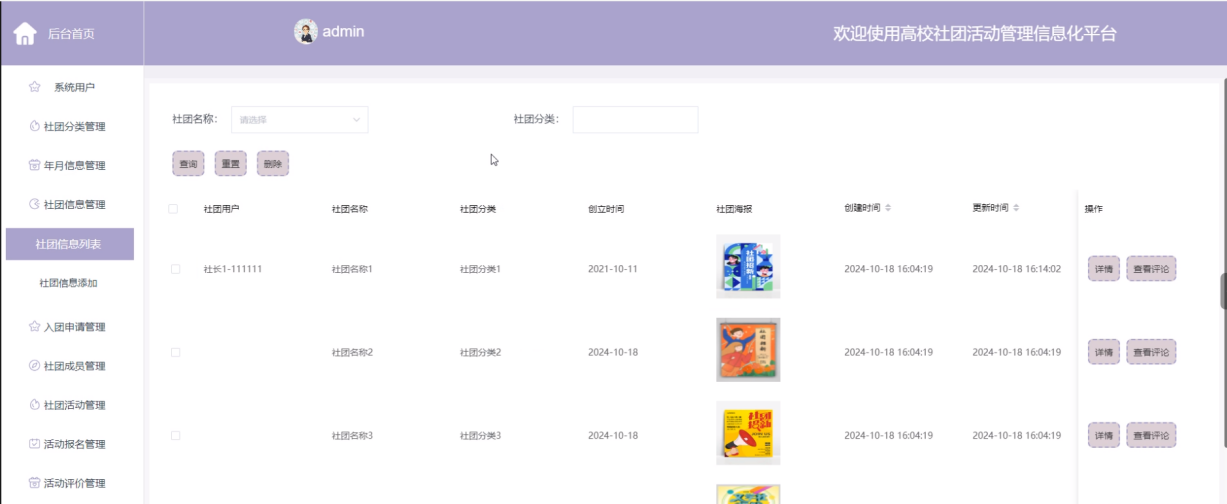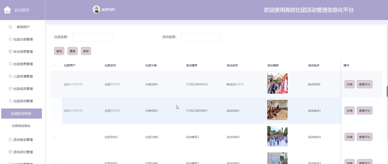 在该模块管理员可以对社团活动列表进行管理和进行社团活动添加。如点击“社团活动列表”进入页面可以查看列表中某个社团活动的详情和评论;点击“社团活动添加”进入页面填写活动名称、活动地点等信息和上传活动海报后点击“提交”即可完成社团活动的添加。以社团活列表为例,其界面如图5-12所示。