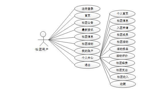 社团用户功能包括注册登录、首页、社团公告、最新资讯、社团信息、社团活动、我的(我的账户、个人中心、退出)。