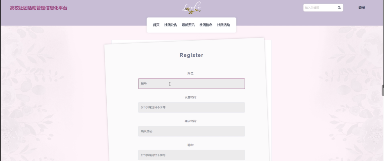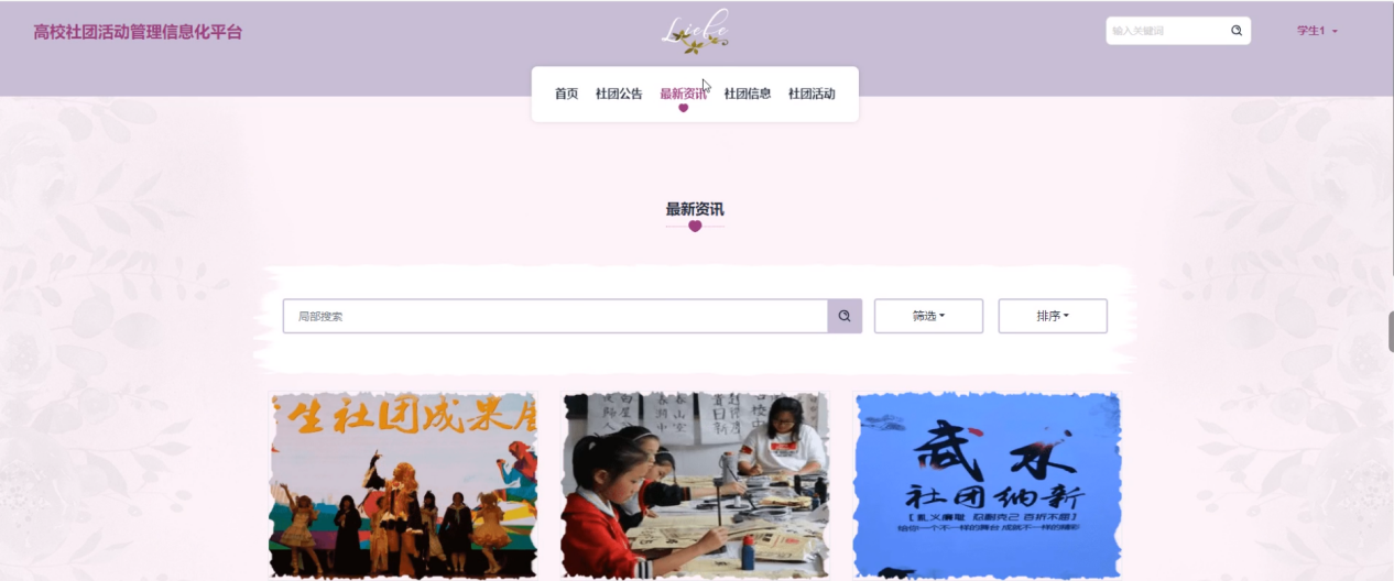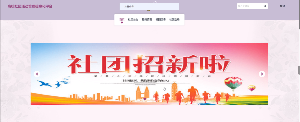 首页界面是用户访问系统的入口页面,它展示系统的首要功能和特色。用户可以查看首页展示的轮播图、最新资讯、社团活动推荐等信息并进行相关操作。其界面如图5-3所示。