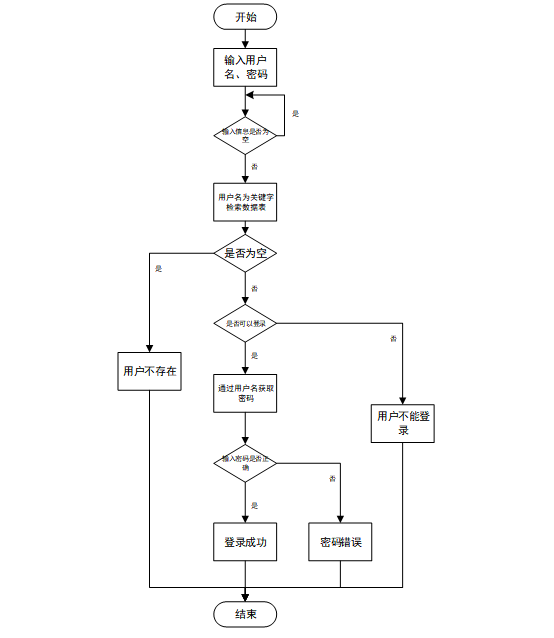 用户输入用户名和密码后,体系先检查输入是否为空,再验证用户名是否存在,若存在则通过用户名获取密码并校验。若密码正确则登录成功,否则提示密码错误。若用户名不存在或无法登录,提示用户操作无效。如图3-5所示。