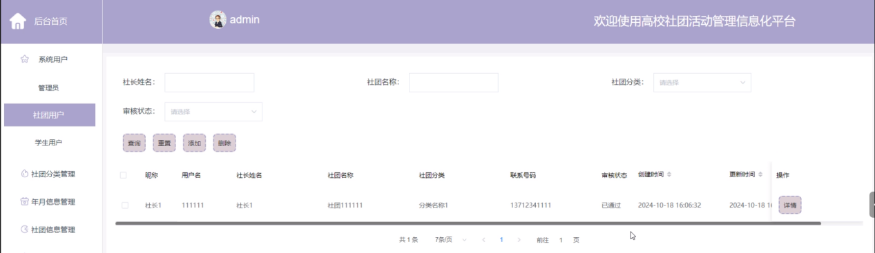管理员许可查看新注册的社团用户信息详情并进行审核,拥有对所有系统用户(管理员、学生用户、社团用户)的账号进行全面运行管控的权限。例如,管理员可以点击查看某个学生用户/社团用户的详情并修改用户状态等信息。其界面如图5-10所示。