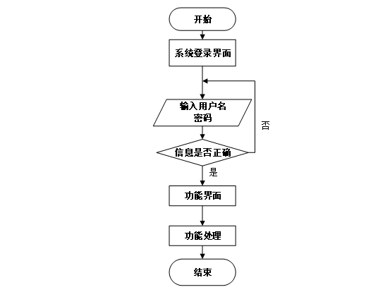 用户首先进入系统登录界面,输入用户名和密码后,系统验证信息是否正确。若验证失败,返回登录界面重新输入;若验证成功,则进入作用界面,执行相应功能处理后结束操作流程。操作流程如图3-6所示。