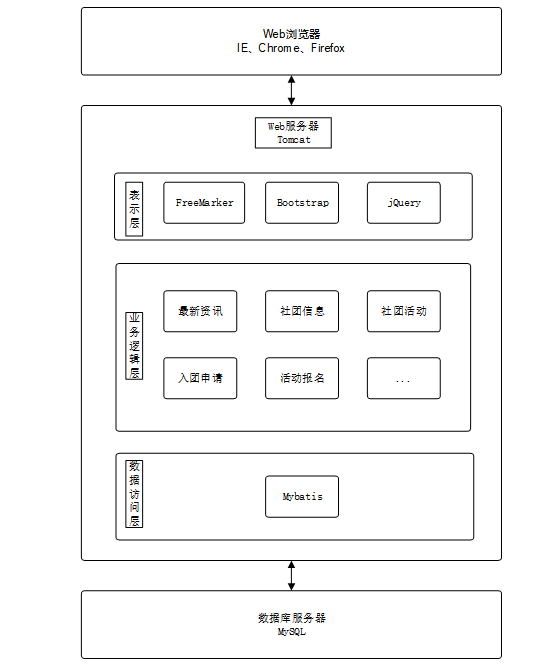 平台由表现层、业务逻辑层、数据访问层和数据库服务器组成。表现层通过浏览器(如IE、Chrome、Firefox)与用户交互,采用FreeMarker、Bootstrap、jQuery等工艺搭建界面呈现。业务逻辑层负责处理系统的核心业务逻辑,通过分模块设计实现功能分离。数据访问层使用MyBatis框架连接数据库,执行数据的增删改查操作。数据库服务器采用MySQL进行数据存储和管理,为系统献出稳定的数据库承受。整个架构通过Tomcat服务器完成用户请求的接收和处理,确保系统的高效运行[6]。整个平台架构如图4-1所示。