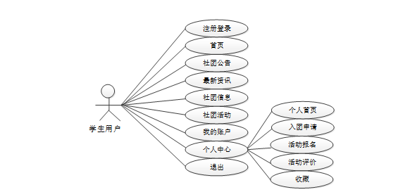 该平台分为学生用户、社团用户和管理员三大角色。学生用户可以通过注册登录后访问首页获取最新的社团公告和资讯信息,浏览不同社团的详细信息及活动安排,并进行入团申请和参与活动等处理。社团用户则在此基础上增加了对社团内部事务的管理能力,如更新社团信息、管理社团活动、管理社团经费等。管理员不仅能够全面掌控系统的各项作用,包括但不限于用户管理、社团分类管理、社团活动管理、经费管理等,还能通过后台数据统计分析来优化资源配置,提升社团活动的质量和效果。