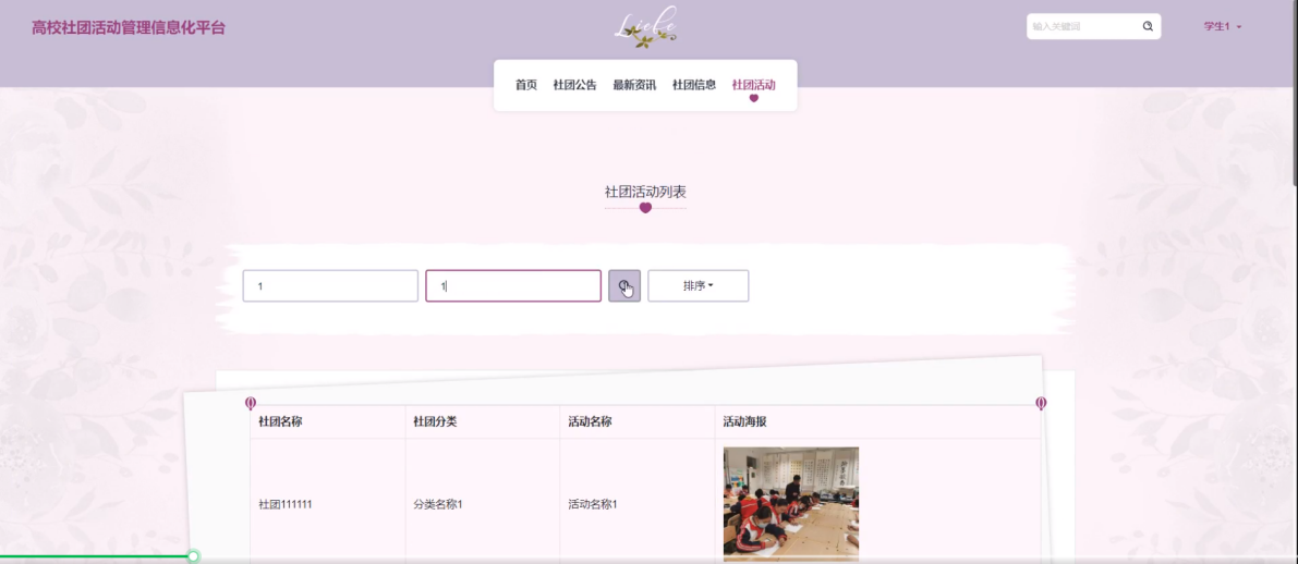 查看社团活动测试 | 学生用户登录系统 进入社团活动页面,使用搜索栏输入社团活动名称搜索社团活动信息,可以搜索到相关社团活动信息 | 无 | 符合预期 |