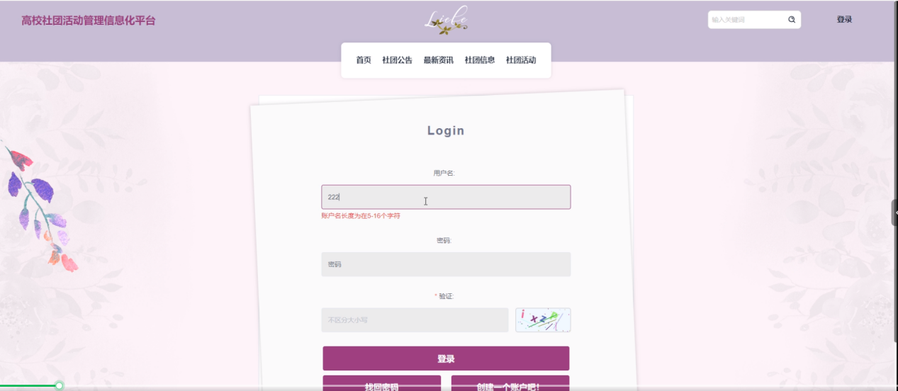 用户登录界面用于已注册的用户进行账号登录,用户输入账号、密码和验证码,系统会对输入的信息进行验证,验证通过后即可完成登录,并供应密码找回的选项。登录界面如图5-2所示。