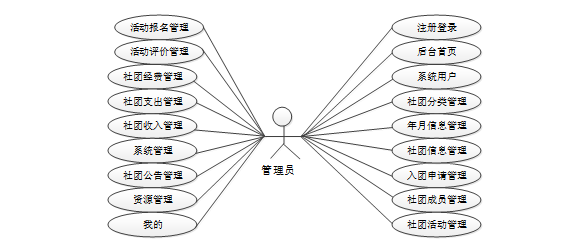 管理员效果包括登录、后台首页、系统用户、社团分类管理、年月信息管理、社团信息管理、入团申请管理、社团成员管理、社团活动管理、活动报名管理、活动评价管理、社团经费管理、社团支出管理、社团收入管理、系统管理、社团公告管理、资源管理、我的(个人信息、修改密码、网站首页、退出)。