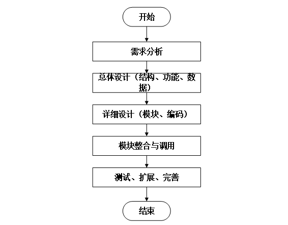 系统开发流程的主要步骤,从需求分析到框架完成的全过程。流程包括需求分析、总体设计(结构、效果、内容)、详细设计(模块、编码)、模块整合与调用,以及测试、扩展和完善,最终完毕系统的开发。本系统的开发流程如图3-4所示