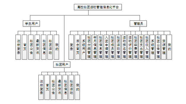功能模块设计是环境开发过程中的重要阶段,它旨在将体系划分为不同的模块,每个模块负责完成特定的功能或任务。高校社团活动管理信息化平台由学生用户、社团用户和管理员这三大用户功能模块组成,每个用户模块又包含具体的功能执行。架构整体效果结构图如下图4.2所示。