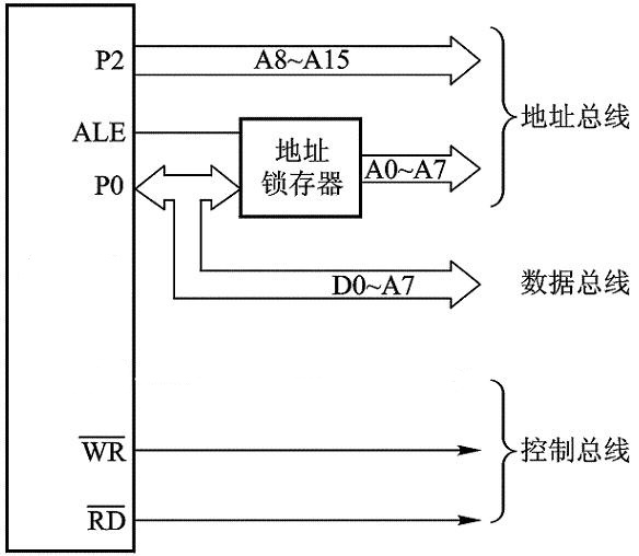 ALE功能为CPU访问外部数据存储器提供低8位地址的锁存控制信号,将单片机P0口发出的低8位地址锁存在片外的地址锁存器中,如图所示
