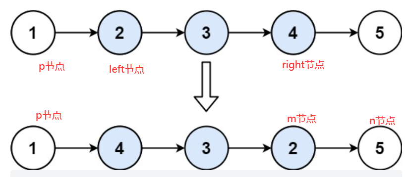 分享一下思路:定义一个虚节点dummy,后续节点指向head节点,获取left之前的节点为p和left节点为m和left之后的节点为n,将m和n节点两两交换,然后交换right - left次,然后把p的net的next指向n节点,换句话说是p节点的后续节点是原先left节点,然后把它的next指向原先right节点的后续节点,把p的next节点指向m节点。