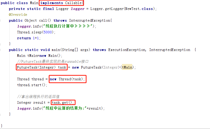 调用FutureTask对象的get方法得道call方法的返回值。FutureTask最终实现的是Runnable和Future接口。