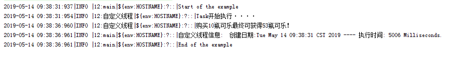 public class MyThread extends Thread { private Date creationDate; private Date startDate; private Date finishDate; public MyThread(Runnable target, String name ){ super(target,name); setCreationDate(); } @Override public void run() { setStartDate(); super.run(); setFinishDate(); } public void setCreationDate() { creationDate=new Date(); } public void setStartDate() { startDate=new Date(); } public void setFinishDate() { finishDate=new Date(); } public long getExecutionTime() { return finishDate.getTime()-startDate.getTime(); } @Override public String toString(){ StringBuilder buffer=new StringBuilder(); buffer.append(getName()+"信息"); buffer.append(": "); buffer.append(" 创建日期:"); buffer.append(creationDate); buffer.append(" ---- 执行时间: "); buffer.append(getExecutionTime()); buffer.append(" Milliseconds."); return buffer.toString(); } }