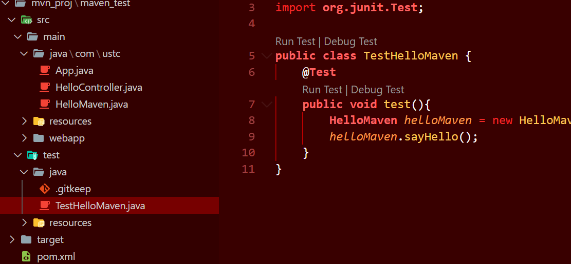 在项目中新建一个HelloMaven类,引入junit坐标,并编写测试类TestHelloMaven.java,注意文件对应的目录位置