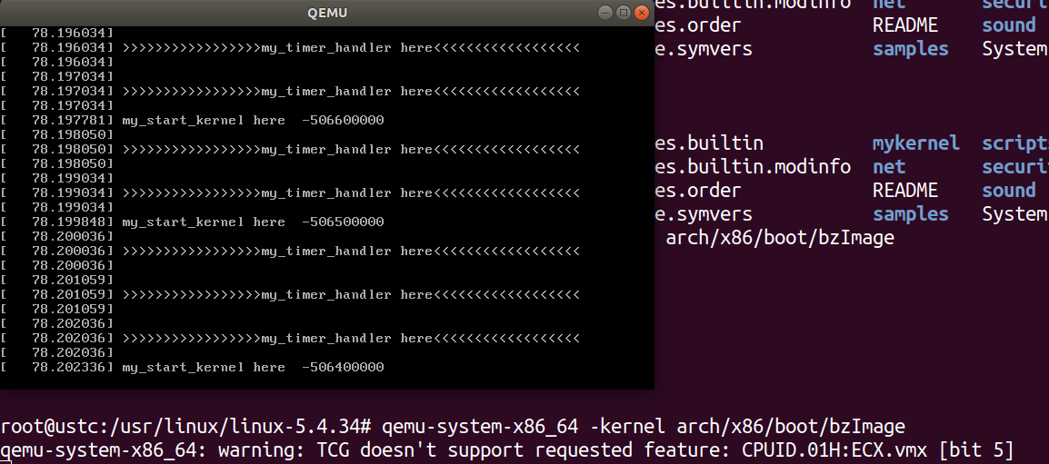 从qemu窗口中可以看到my_start_kernel在执行,同时my_timer_handler时钟中断处理程序周期性执行。进入mykernel目录可以看到qemu窗口输出的内容的代码mymain.c和myinterrupt.c。当前有一个CPU执行C代码的上下文环境,同时具有中断处理程序的上下文环境,通过Linux内核代码模拟了一个具有时钟中断和C代码执行环境的硬件平台。