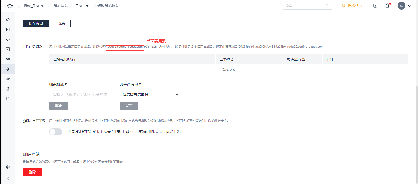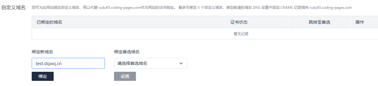 这个仓库SSH哪里找? 打开 Coding官网 如果你没团队就点击免费注册 接着按照那个来就行 注册完后进入你的团队(好像会自动进去) 点击全部项目 创建项目 项目模板选择DevOps 项目 接着填写一大堆的东西 接着选择完成创建 创建完成后在公告下面会有个 你用户名/仓库名的东西 下面有个HTTPS HTTPS旁边有个小三角 点一下选择SSH 接着右边会发生变化 那就是SSH地址 例如: git@e.coding.net:企业版用户名/仓库名.git 接着我们需要选择持续集成-静态网站 这时候可能提示你需要实名认证 这个不会泄露 随便找个或者自己弄个就好了 实名完成后点击立即发布静态网站 网站名称自填 接下来在跳转的页面里选择设置 {% note info %} 睡觉去了,明天还要上课,明天下午再写后续 {% endnote %} 记下xxxxxx.coding-pages.com 打开你的域名解析 这边以slqwq.cn为例 添加一个如上图的解析记录 主机记录随便 要实现slqwq.cn这样的顶级访问主机记录就为@ 要实现www.slqwq.cn也一样主机记录改为www 因此要什么前缀主机记录就改什么 这里不多讲 这边的绑定新域名写你添加记录后的域名 填写完成后点击绑定 接下来在已绑定的域名里面就会出现你绑定的域名 右边的证书状态指的是SSL 当你的SSL成功申请后应该是正常 下面的强制HTTPS为可选 当你要部署到Coding上时就输入hexo clean && hexo d -g