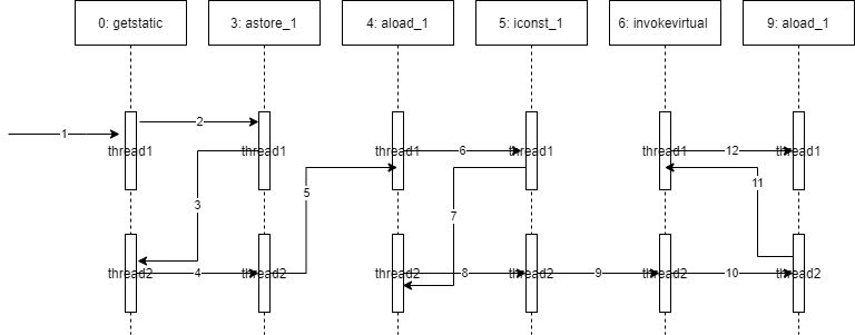 - thread2执行完1(0:getstatic)和(3:astore_1)后CPU切回到thread1,从thread1的程序计数器中取出下一条指令要执行的地址4对应的指令aload_1进行执行,执行到5(5:iconst_1)时,CPU切换到thread2,此时thread1的程序计数器记录下一条指令的地址6...