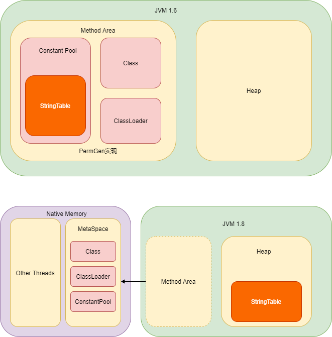 由于不同版本的JVM方法区的实现不同,在处理方法区内存溢出时也要注意JVM的版本,下面从1.6和1.8两个版本的JVM来说明这个问题