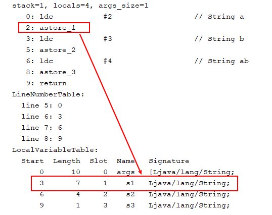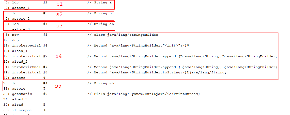 发现s5并没有采用s4的StringBuilder方式,而是直接识别为ab,造成这个的原因是javac在编译期间的优化,结果在编译器确定为ab,此时执行指令29: ldc ,先从串池中查找字符串"ab",如果有就直接使用串池中的"ab",没有再加入到串池中,很显然前面的代码在处理s3时已经将"ab"放入了串池中,因此这里的s3和s5都是串池中的"ab",==比较的结果为true