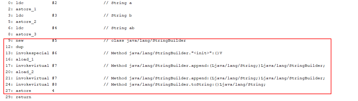 String x2 = new String("c") + new String("d");//new StringBuilder().append("c").append("d").toString();