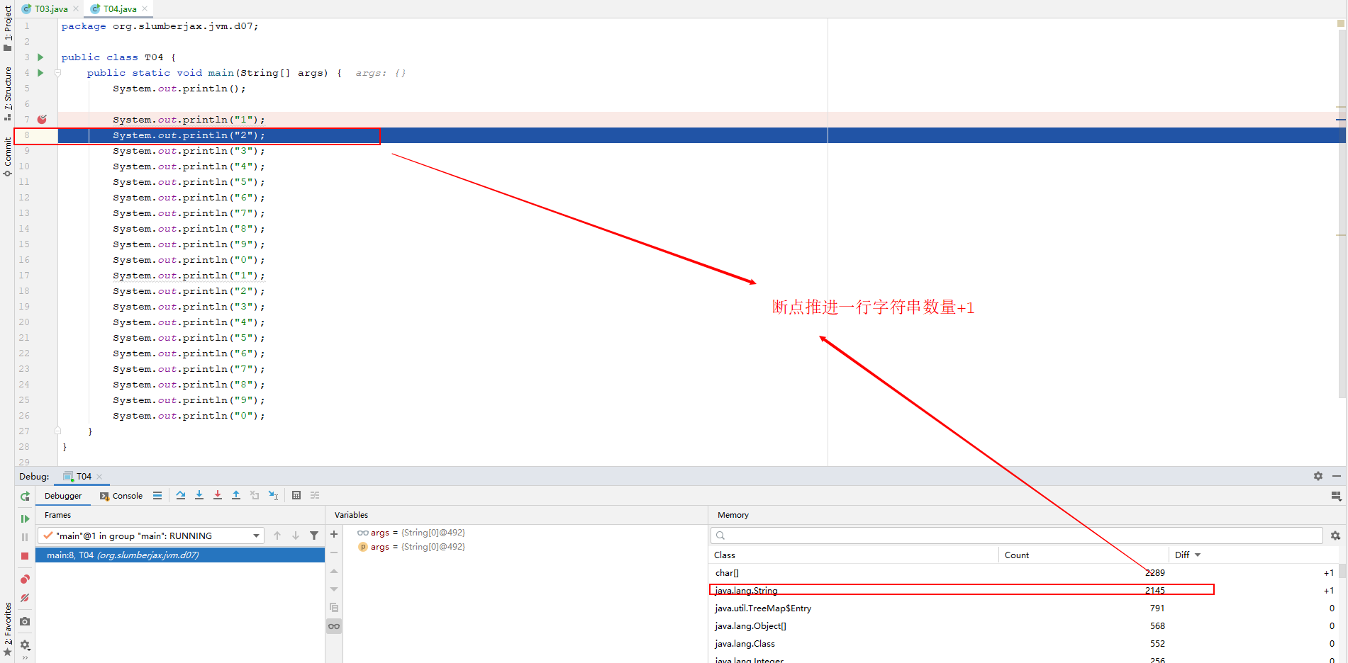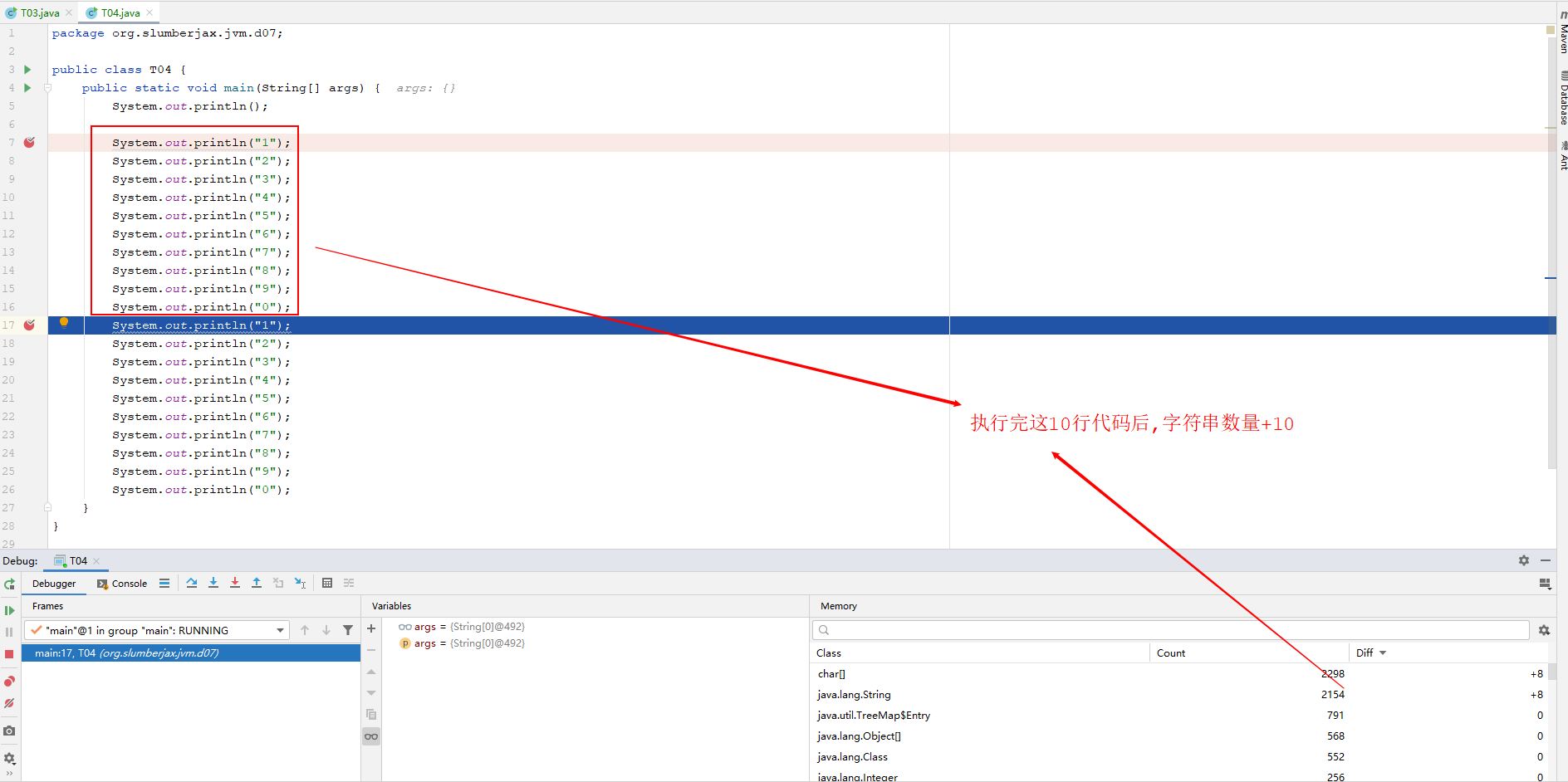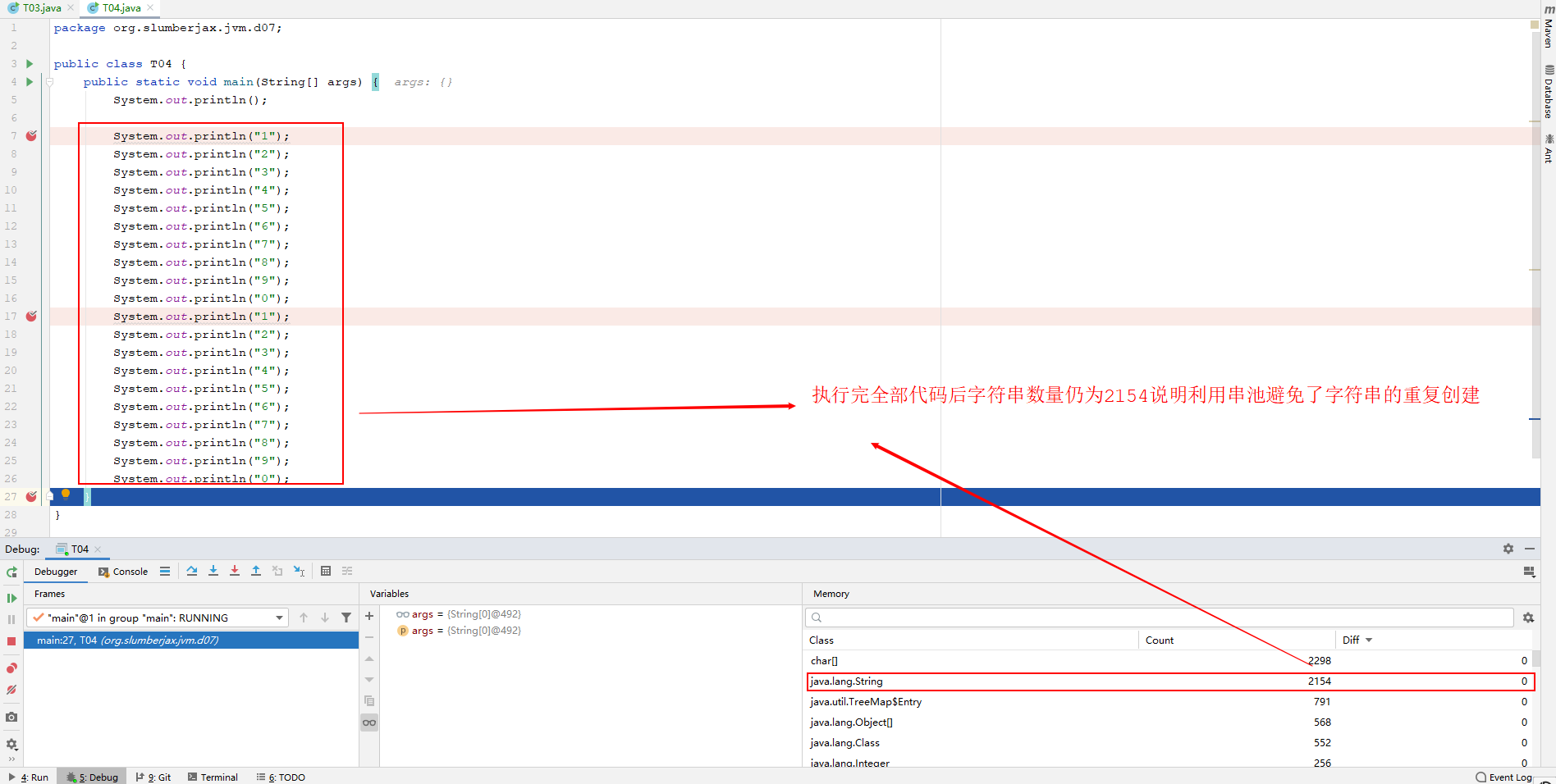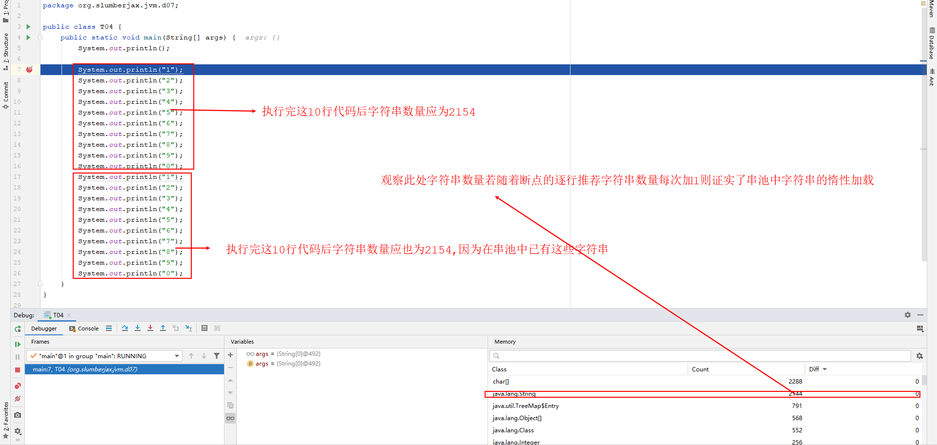 借助Intellij Idea的断点调试功能来验证前面提到的串池惰性,字符串延期初始化(执行到具体行的代码时才去初始化字符串),代码如下: