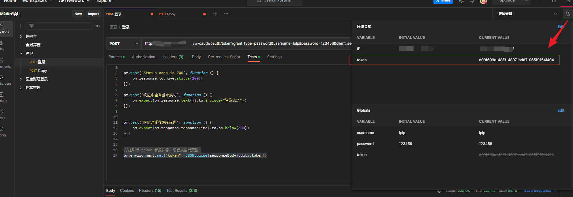 step2:点击send,获取的token会自动放到右上角的环境变量中