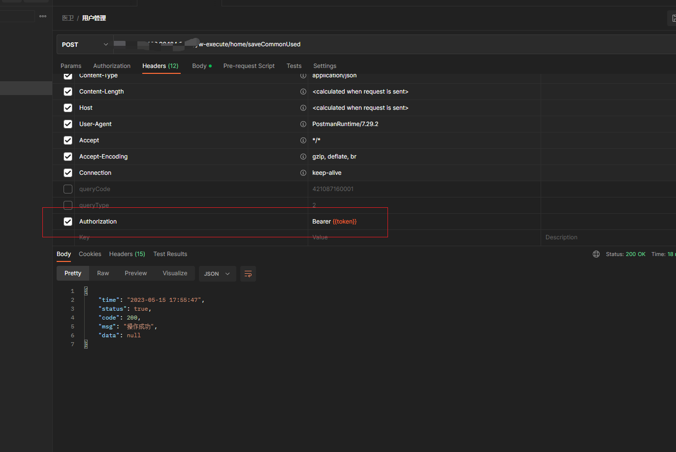 step3:在引用的接口中带入参数: Bearer {{token}},然后就可以响应成功了