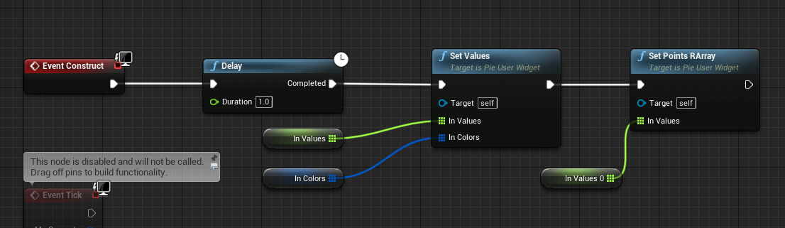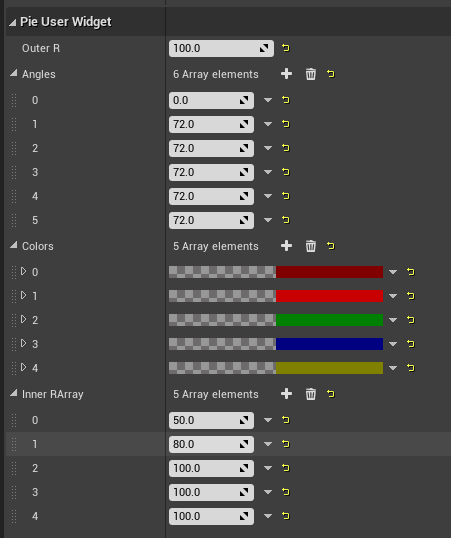 1 // Fill out your copyright notice in the Description page of Project Settings. 2 3 #pragma once 4 5 #include "CoreMinimal.h" 6 #include "Blueprint/UserWidget.h" 7 #include "PieUserWidget.generated.h" 8 9 /** 10 * 11 */ 12 UCLASS(BlueprintType, Blueprintable) 13 class Test_API UPieUserWidget : public UUserWidget 14 { 15 GENERATED_BODY() 16 protected: 17 virtual int32 NativePaint(const FPaintArgs& Args, const FGeometry& AllottedGeometry, const FSlateRect& MyCullingRect, FSlateWindowElementList& OutDrawElements, int32 LayerId, const FWidgetStyle& InWidgetStyle, bool bParentEnabled) const override; 18 19 public: 20 UPROPERTY(EditAnywhere,BlueprintReadWrite) 21 float OuterR; 22 UPROPERTY(EditAnywhere,BlueprintReadWrite,meta=(ClampMin = 0, ClampMax = 360)) 23 TArray<float> Angles; 24 UPROPERTY(EditAnywhere,BlueprintReadWrite) 25 TArray<FColor> Colors; 26 UPROPERTY(EditAnywhere,BlueprintReadWrite,meta=(ClampMin = 0, ClampMax = 360)) 27 TArray<float> InnerRArray; 28 29 UFUNCTION(BlueprintCallable) 30 void SetValues(const TArray<float>& InValues, const TArray<FColor>& InColors); 31 UFUNCTION(BlueprintCallable) 32 void SetPointsRArray(const TArray<float>& InValues); 33 34 private: 35 void DrawPart(FSlateWindowElementList& OutDrawElement, 36 const FGeometry& AllottedGeometry, 37 int LayerId, float R, 38 int32 InBeginAngle, int32 InEndAngle, 39 const FColor& InColor, 40 float StartR, 41 float EndR) const; 42 43 FColor GetCircleColor(int32 index) const; 44 float GetPointsR(int32 index) const; 45 };