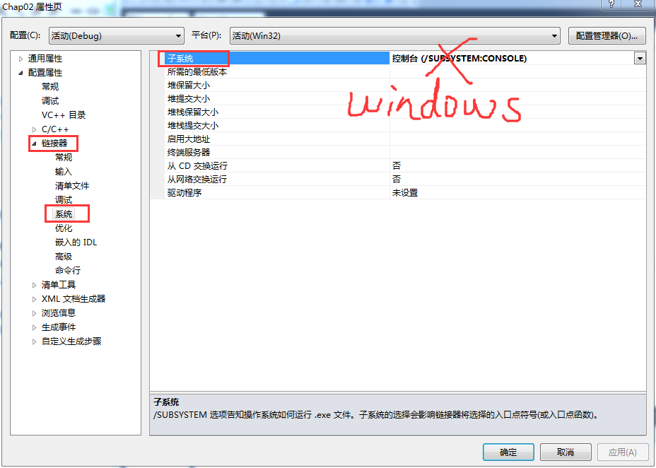Step2.在左边栏中依次选择:Configuration Properties->C/C++->Preprocessor,然后在右边栏的Preprocessor Definitions对应的项中删除_CONSOLE, 添加_WINDOWS.Step3.在左边栏中依次选择:Configuration Properties->Linker->System,然后在右边栏的SubSystem对应的项改为Windows(/SUBSYSTEM:WINDOWS)如果我们需要的是控制台程序